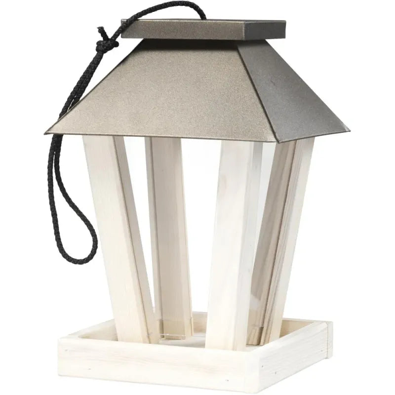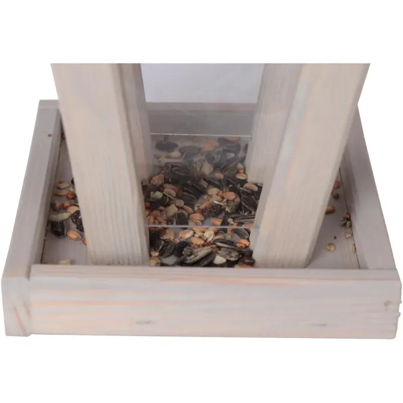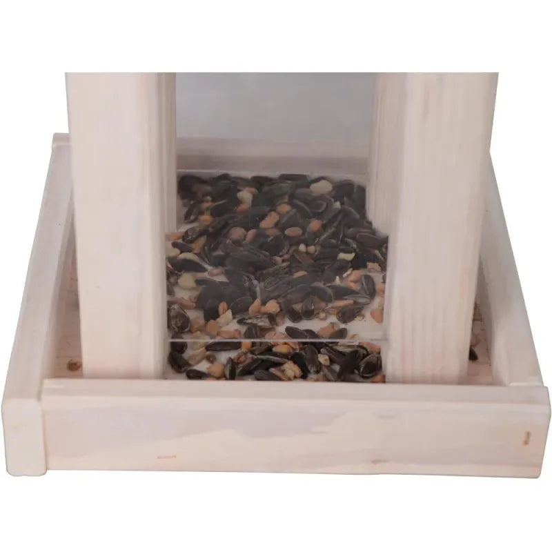 Die Futterstelle kann von allen vier Seiten besucht werden. Die erhöhten Leisten verhindern das Abfallen des Futters und bieten eine Sitzmöglichkeit für die Vögel.